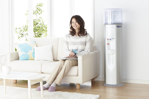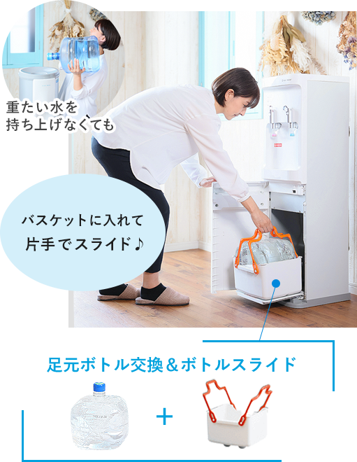 重たい水ボトルを持ち上げずに、足元でかんたんにボトル交換方式。 主婦の方には馴染み深い買い物かごをヒントに、天然水ボトルを片手で簡単に持ちやすく、正確にセットできるように改良を重ね開発した「ボトルスライド」方式です。