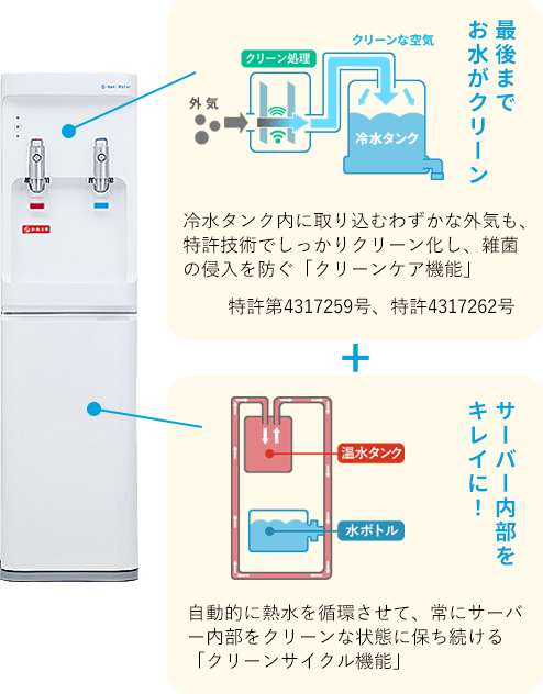 ウォーターサーバー内部を常にクリーンな状態に保つWクリーン機能を搭載。 天然水の「鮮度」を守り続けるので、最後の一滴まで汲みたてのおいしさが続きます。